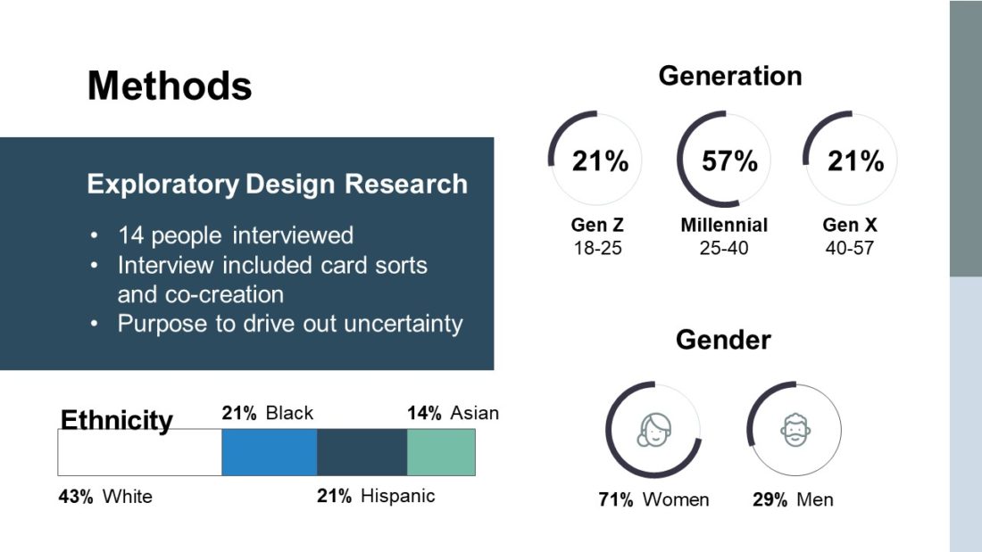 Solution: I led a team in exploratory design research, taking our internal client from questions to answers in 3 weeks and less than $2500.