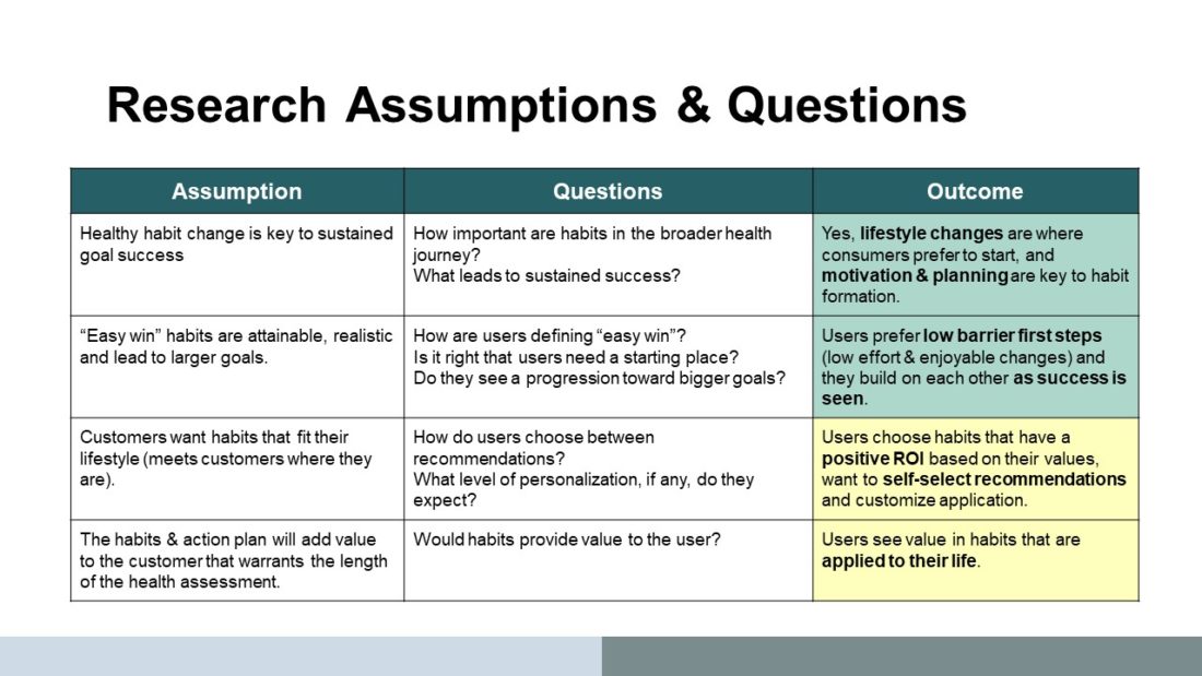 Problem: A team within Amway was charged with launching a new platform that would engage customers in a series of questions and offer customized recommendations for new habits that might advance their goals. But the team wasn’t sure of what types of habits that they should recommend, how personalized the recommendations needed to be to offer value, and how to frame recommendations in a way that made the habits approachable to the user.