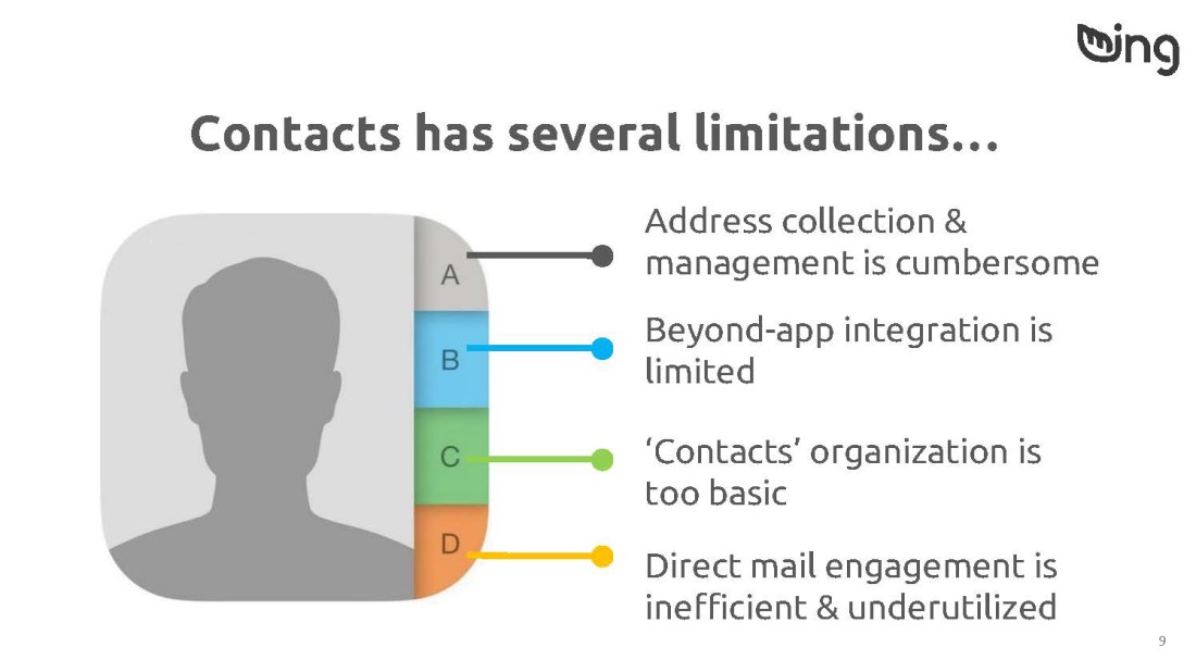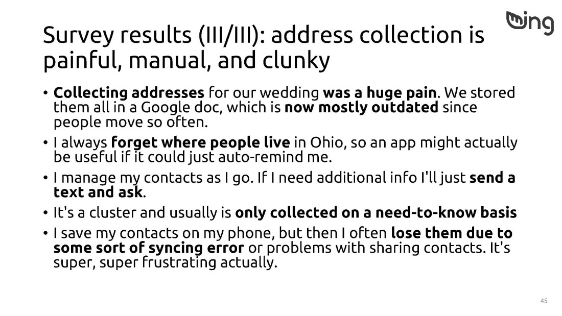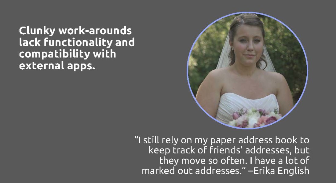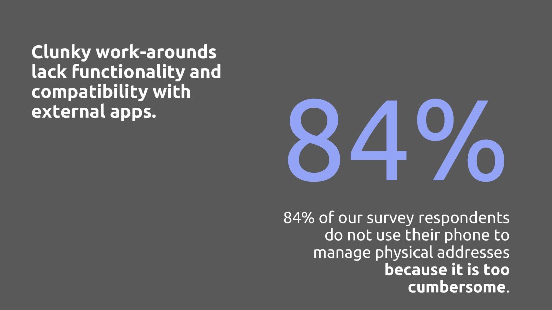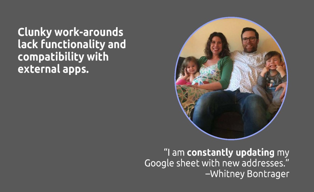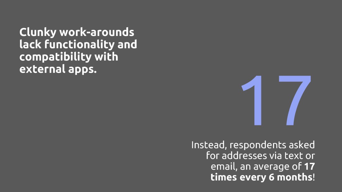 Problem: In a world of digital messaging and email, snail mail still has its place: wedding invitations and baby announcements, for example. And real life addresses are critical for ordering an uber or entering a destination in a GPS. But texting and calling for an address gets old fast. How might we improve the way users track and interact with their contacts’ addresses?